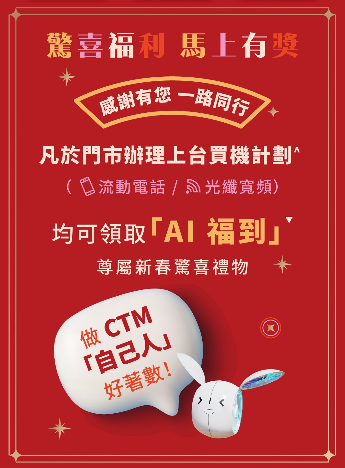 ▼ 每個合資格的流動電話服務號碼/互聯網代號於每筆交易時僅可參與「AI福到」一次。「AI福到」所贈之禮品數量有限,送完即止,款式隨機,不設指定。