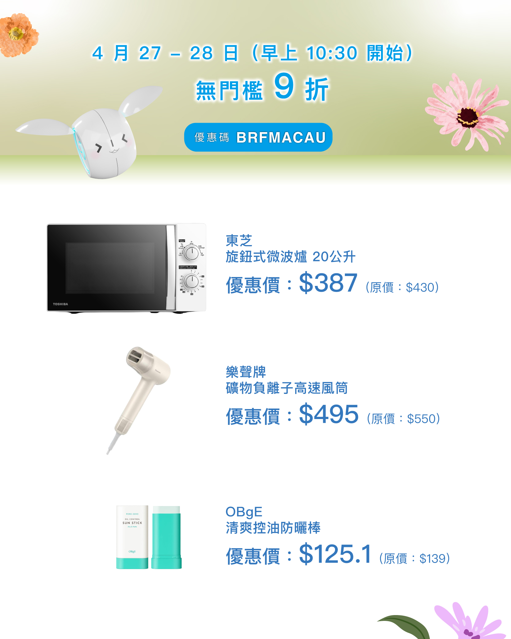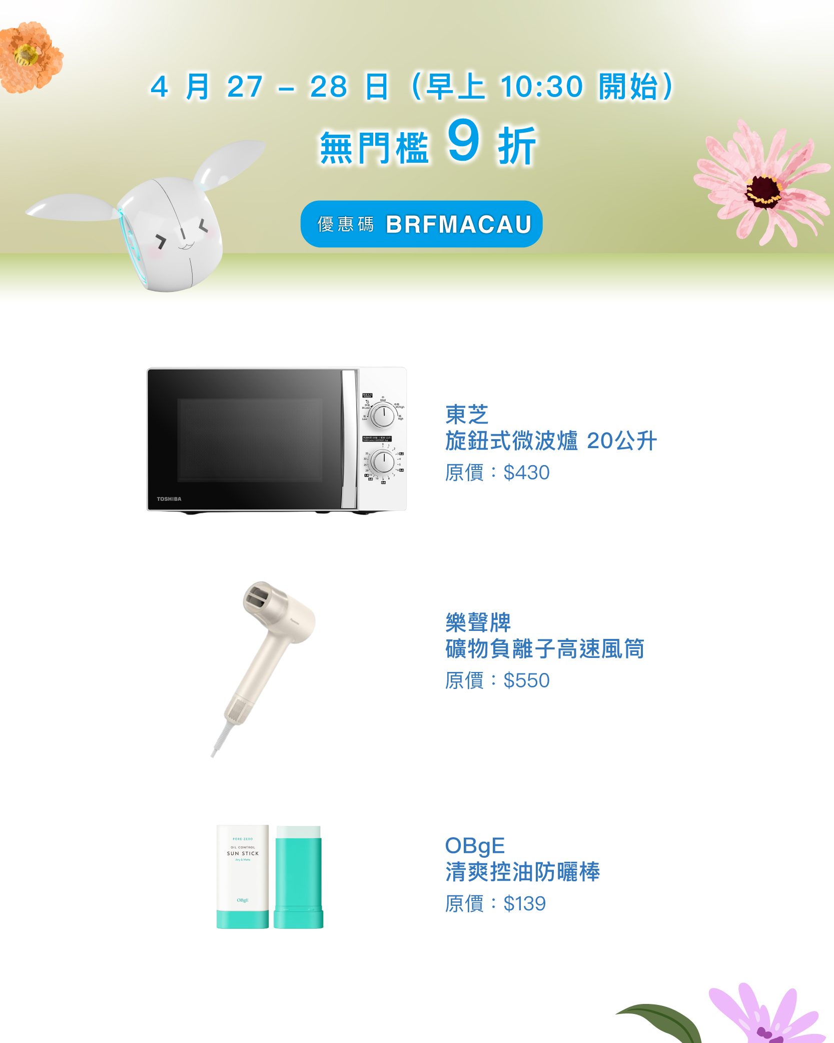 - 使用優惠碼【BRFMACAU】可享9折 優惠 ,最高折$100 , 每個帳戶只於當月只可使用一次。
