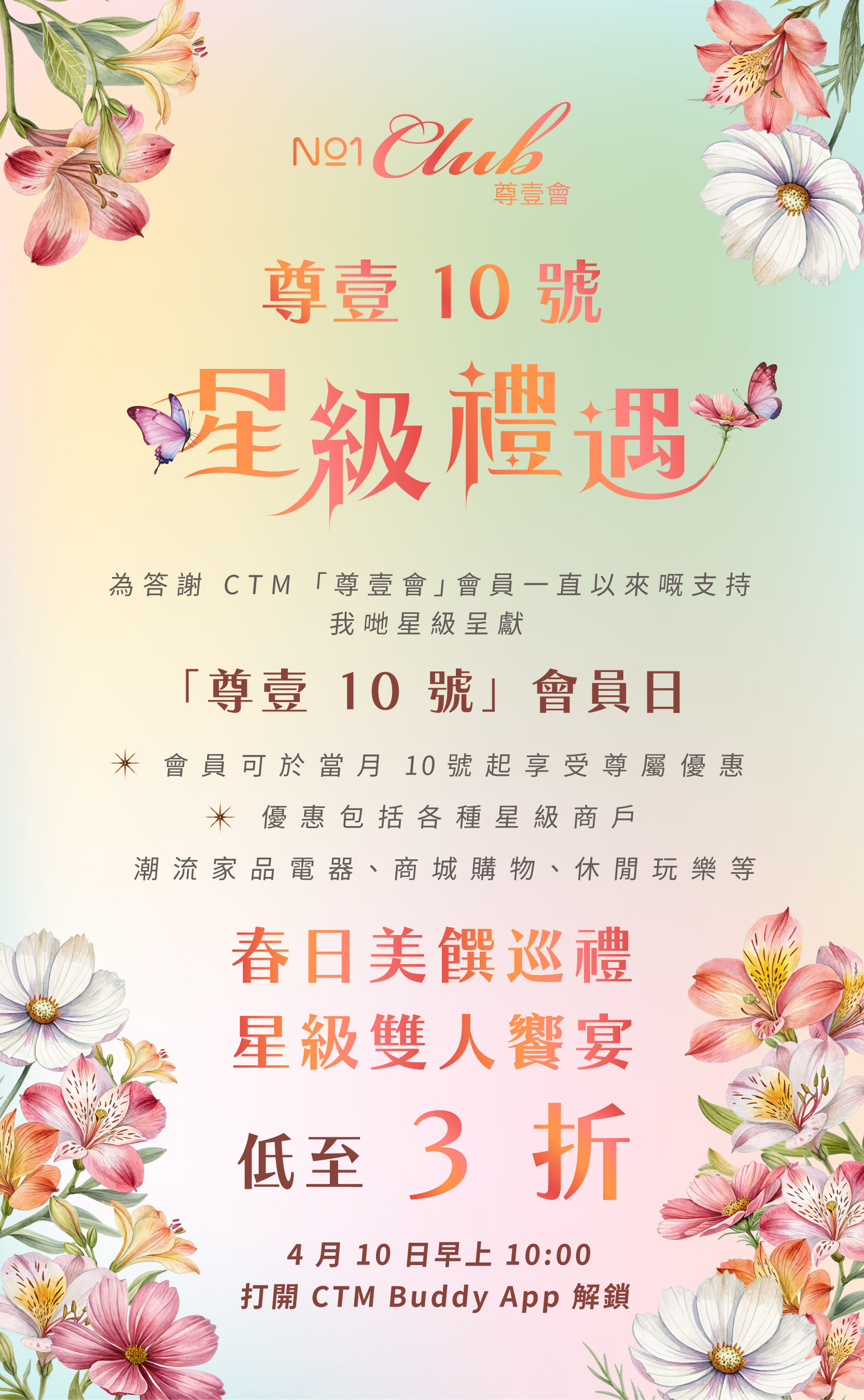 註:優惠期為 2026 年 4 月 10 – 30 日。此優惠只適用於「尊壹會」會員並受條款及細則所約束。貨 / 贈品數量有限,售 / 送完即止。客戶需於 CTM Buddy App 兌換優惠券方可享優惠價。
