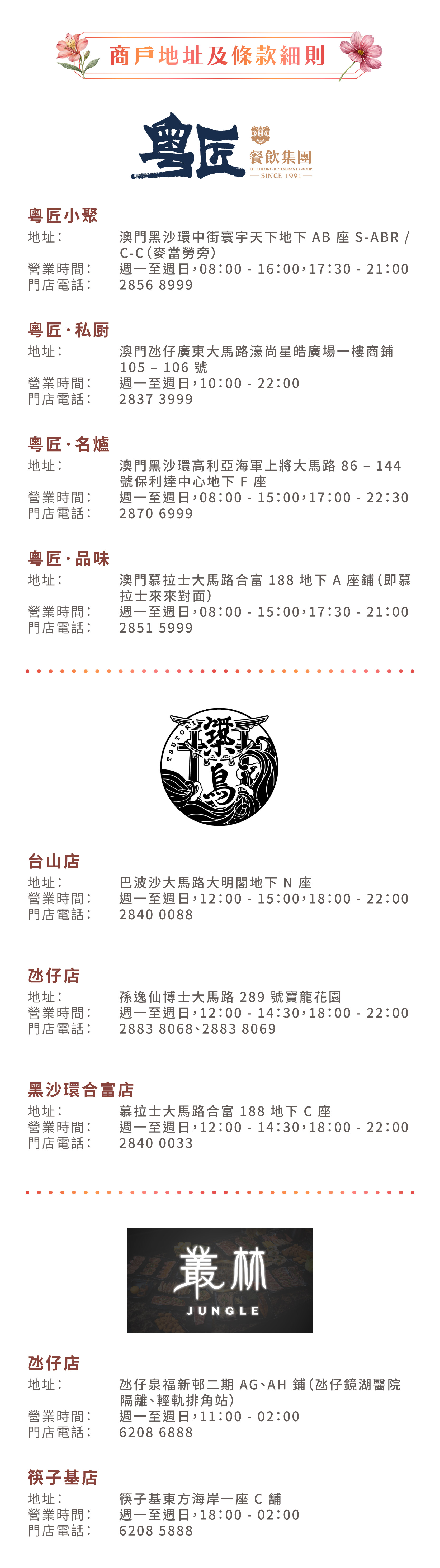 l 粵匠中菜餐只適用於(粵匠私廚 / 品味 / 名爐 / 小聚)。