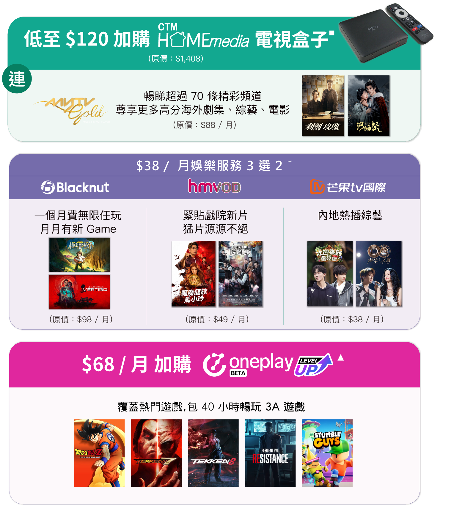 ** 此優惠為回贈後月費,由原月費 $498 / 1Gbps 計算及只適用於新申請 / 現有無產品束縛之客戶。回贈後月費 = (產品預繳金額 / 24 個月合約)。 * 此優惠只適用於新申請 / 現有月費升級且無產品合約束縛之客戶,客戶若於申請日前 2 個月內有取消 / 降級服務紀錄,並重新申請上網,該客戶將不可獲得此優惠。申請光纖 360° 服務包括一個數據機及兩個路由器。如客戶因空間或使用需求需額外增加路由器,每個額外路由器之優惠月費為 $10(原價:$15 / 月)。 # 客戶若於 17:00 前,申請 1Gbps / 2Gbps 光纖360° 計劃,最快可享 2 個工作日內完成安裝。若客戶於 17:00 後申請,則視為隔天申請,有關特快安裝安排將作順延。具體的特快安裝日期將根據安裝檔期而定,若無法符合,將會有專人聯絡客戶並提供最快的安裝日期。 ◆ 申請此優惠客戶可免費獲贈Home Media 電視盒子連 6 個月 myTV Gold 服務(1個裝置電視盒子版 / 智能電視版 + 2 個裝置 App / 網頁版);優惠期後,若客戶繼續使用 myTV Gold 服務,將以優惠月費 $58(原價:$88 / 月)於賬單內收取。每個互聯網月費賬戶只可享此優惠乙次。 ■ 此優惠只適用於新申請 Home Media 娛樂服務 – myTV Gold 服務之客戶。流動電話 / 居家光纖寬頻客戶可享優惠價 $120 購買 Home Media 電視盒子連 6 個月 Home Media 娛樂服務 – myTV Gold 服務(1 個裝置電視盒子版 / 智能電視版 + 2 個裝置 App / 網頁版)。優惠期後,若客戶繼續使用相關服務,將以優惠月費 $58 / 月(原價:$88 / 月)於賬單內自動收取;每個流動電話 / 居家光纖寬頻客戶只可享此優惠乙次。 ~ 新申請或續約居家光纖寬頻之客戶,可享 $38 / 月任選兩項 Home Media 娛樂服務(芒果 TV 國際至尊服務 / Blacknut 雲遊戲服務 / hmvod 服務)。優惠期至 2026 年 3 月 31 日。首 3 個月優惠期後,如客戶繼續使用相關服務,將以月費優惠組合 $48 / 月於賬單內自動收取。 ▴ OnePlay「雲遊戲服務」(原價:$80 / 30 小時)。使用「雲遊戲服務」時,客戶必須於網上遊戲商店(Steam、Epic、Ubisoft、Blizzard、EA、Microsoft 和 Fanatical)預先購買遊戲。「雲遊戲服務」可用的遊戲請參閱 OnePlay 雲遊戲平台服務網頁 (www.oneplay.in) 遊戲庫。 ▼ 此折扣券只適用於參與月費 $250 或以上居家光纖寬頻買機月費計劃之新上台 / 轉台 / 無產品合約束縛的客戶,並須簽署 24 個月服務合約。