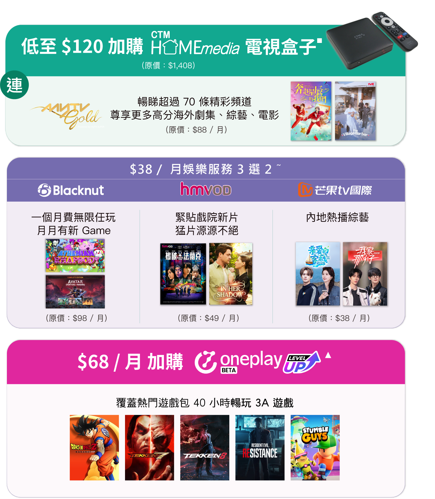 # 客戶若於 17:00 前,申請 5Gbps 或以上計劃及安裝地址為指定樓宇,最快可享 1 個工作天內完成安裝。若客戶於 17:00 後申請,則視為隔天申請,有關特快安裝安排將作順延。具體的特快安裝日期將根據安裝檔期而定,若無法符合,將會有專人聯絡客戶並提供最快的安裝日期。 ■ 此優惠只適用於新申請 Home Media 娛樂服務 – myTV Gold 服務之客戶。流動電話 / 居家光纖寬頻客戶可於優惠期 2026 年 5 月 31 日前,享優惠價 $120 購買 Home Media 電視盒子連 6 個月 Home Media 娛樂服務 – myTV Gold 服務(1 個裝置電視盒子版 / 智能電視版 + 2 個裝置 App / 網頁版)。優惠期後,若客戶繼續使用相關服務,將以優惠月費 $58 / 月(原價:$88 / 月)於賬單內自動收取;每個流動電話 / 居家光纖寬頻客戶只可享此優惠乙次。 ~ 新申請或續約居家光纖寬頻之客戶,可享 $38 / 月任選兩項 Home Media 娛樂服務(芒果 TV 國際至尊服務 / Blacknut 雲遊戲服務 / hmvod 服務)。優惠期至 2026 年 4 月 30 日。首 3 個月優惠期後,如客戶繼續使用相關服務,將以月費優惠組合 $48 / 月於賬單內自動收取。 ▴ OnePlay「雲遊戲服務」(原價:$80 / 30 小時)。使用「雲遊戲服務」時,客戶必須於網上遊戲商店(Steam、Epic、Ubisoft、Blizzard、EA、Microsoft 和 Fanatical)預先購買遊戲。「雲遊戲服務」可用的遊戲請參閱 OnePlay 雲遊戲平台服務網頁 (www.oneplay.in) 遊戲庫。