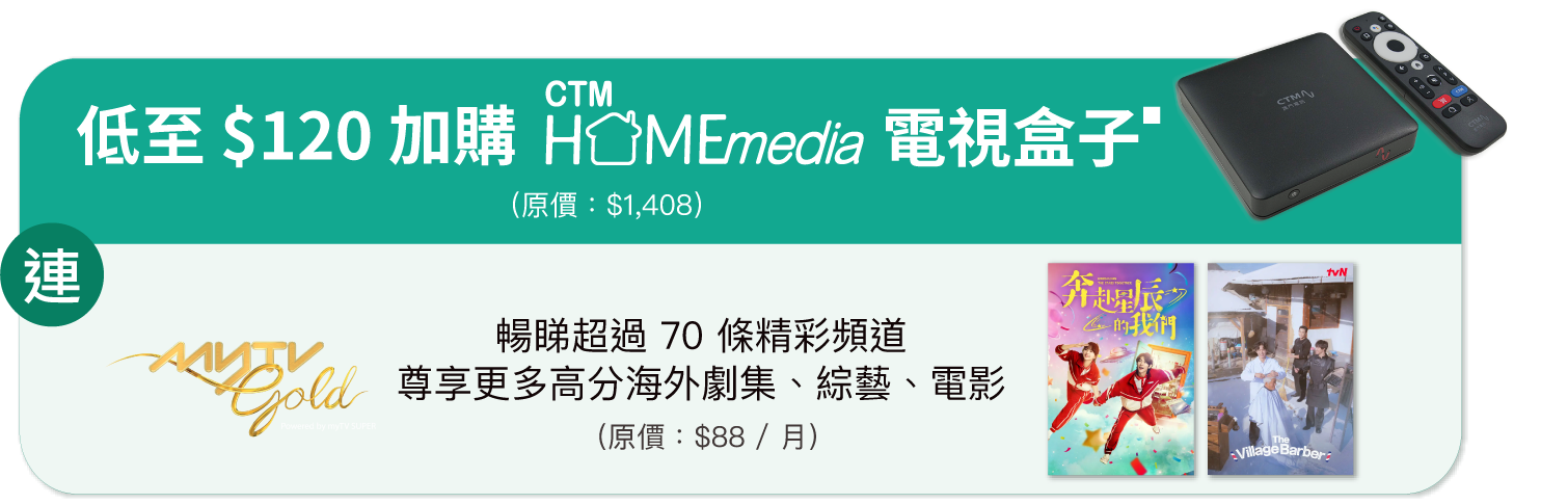 ▲ 此優惠只適用於 $168 / 600Mbps 關愛上台買機計劃,並只適用於指定機型。 ■ 此優惠只適用於新申請 Home Media 娛樂服務 – myTV Gold 服務之客戶。流動電話 / 居家光纖寬頻客戶可於優惠期 2026 年 5 月 31 日前,享優惠價 $120 購買 Home Media 電視盒子連 6 個月 Home Media 娛樂服務 – myTV Gold 服務(1 個裝置電視盒子版 / 智能電視版 + 2 個裝置 App / 網頁版)。優惠期後,若客戶繼續使用相關服務,將以優惠月費 $58 / 月(原價:$88 / 月)於賬單內自動收取;每個流動電話 / 居家光纖寬頻客戶只可享此優惠乙次。