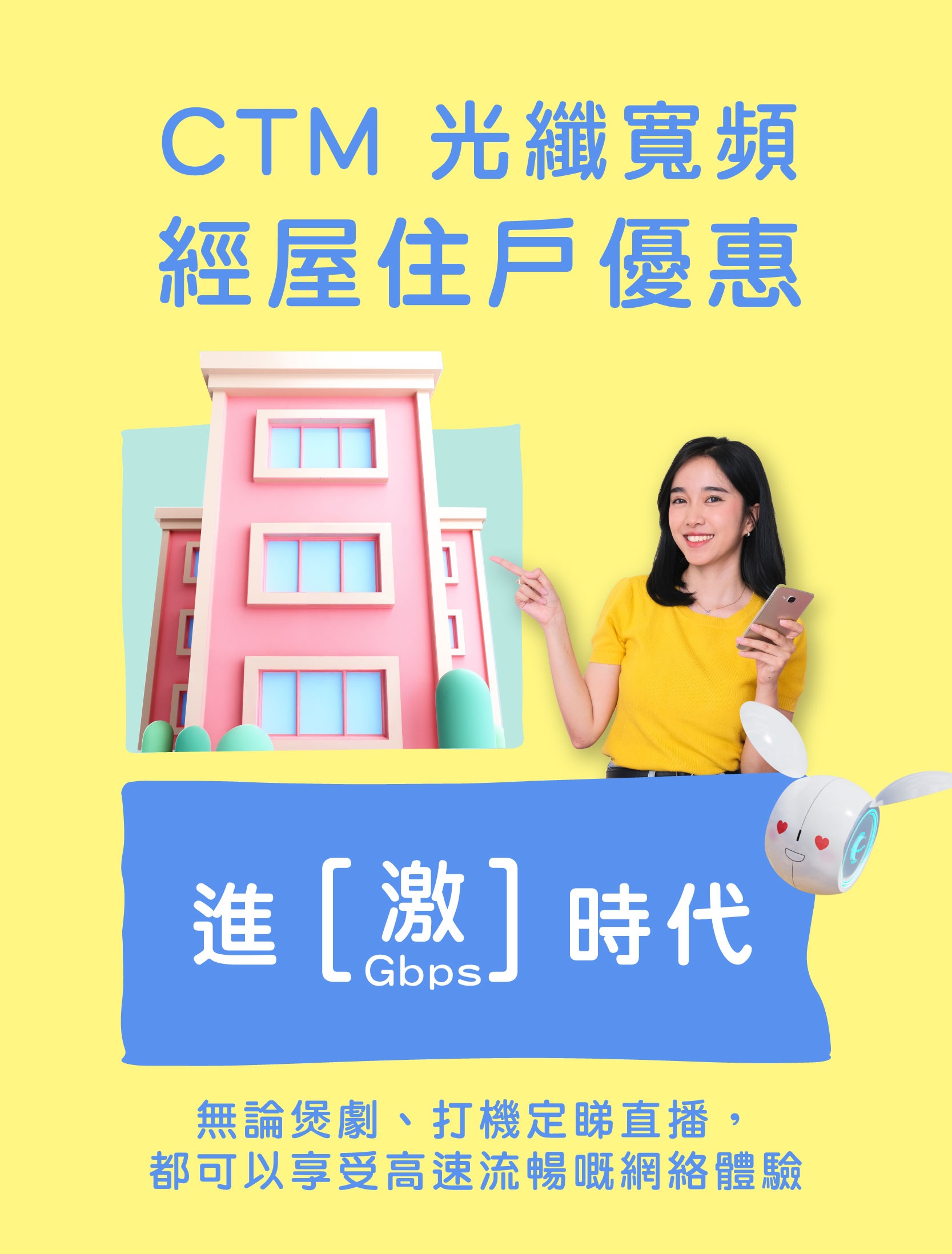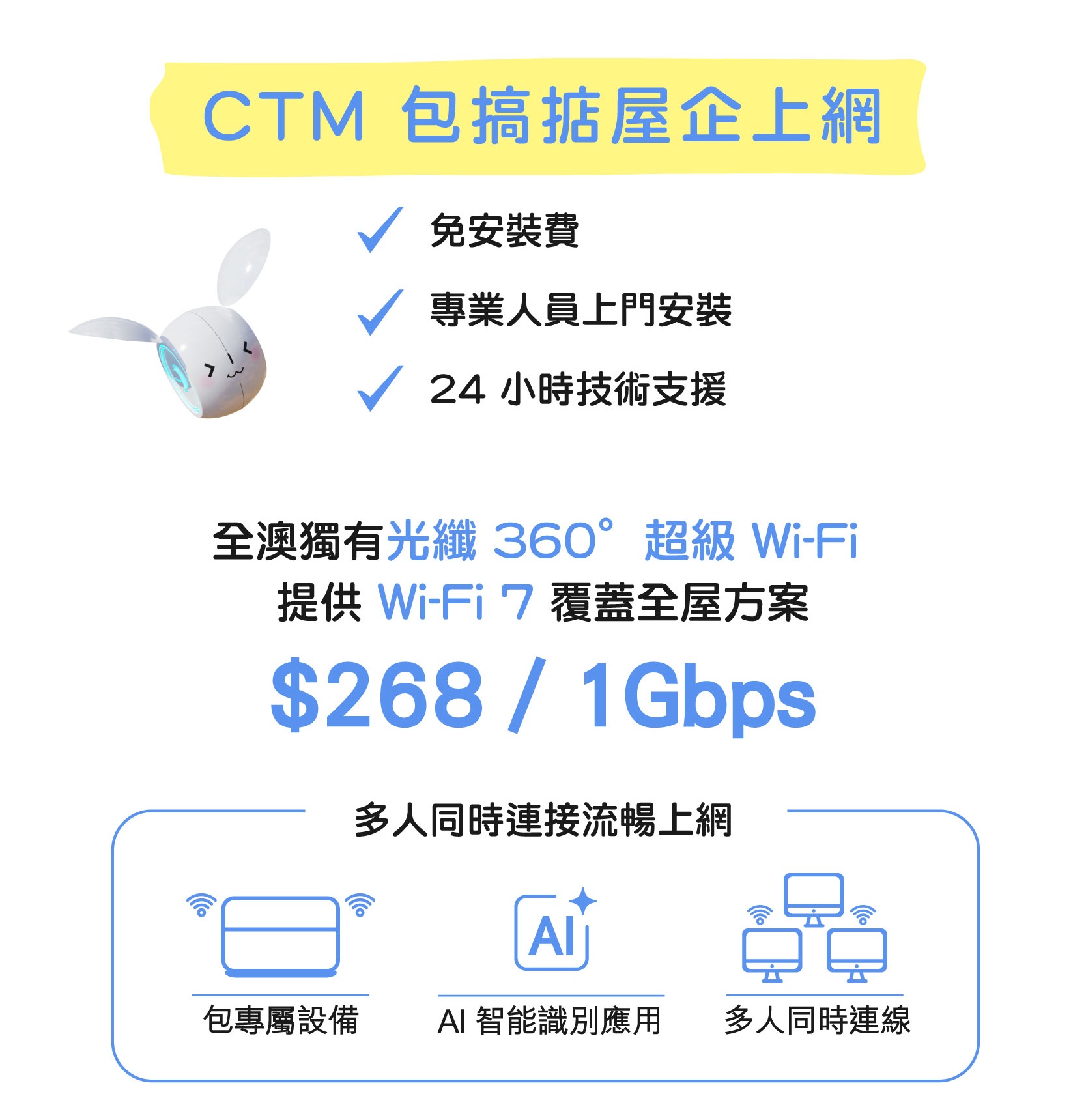 註: - 最新優惠月費及有效期日期至 2025 年 12 月 31 日。 - 優惠只適用於新申請 / 現有無產品合約束縛之客戶,客戶需簽署 24 個月合約。客戶若於申請日前 2 個月內有取消 / 降級服務紀錄,並重新申請上網,該客戶將不可獲得此優惠。申請光纖 360° 服務包括一個數據機及兩個路由器。如客戶因空間或使用需求需額外增加路由器,每個額外路由器之優惠月費為 $10(原價:$15 / 月)。 - 此優惠適用對象為經屋住戶,以及光纖寬頻安裝地址必須為經濟房屋方可享有指定優惠,每個客戶只可享優惠乙次。 - 以上優惠及最新價格如有更改,恕不另行通知。貨 / 贈品數量有限,售 / 送完即止。 - 所有價格以澳門幣計算。 - 以上優惠受相關之服務條款所約束。以 CTM 的可接受使用政策 (AUP) 為準。 |