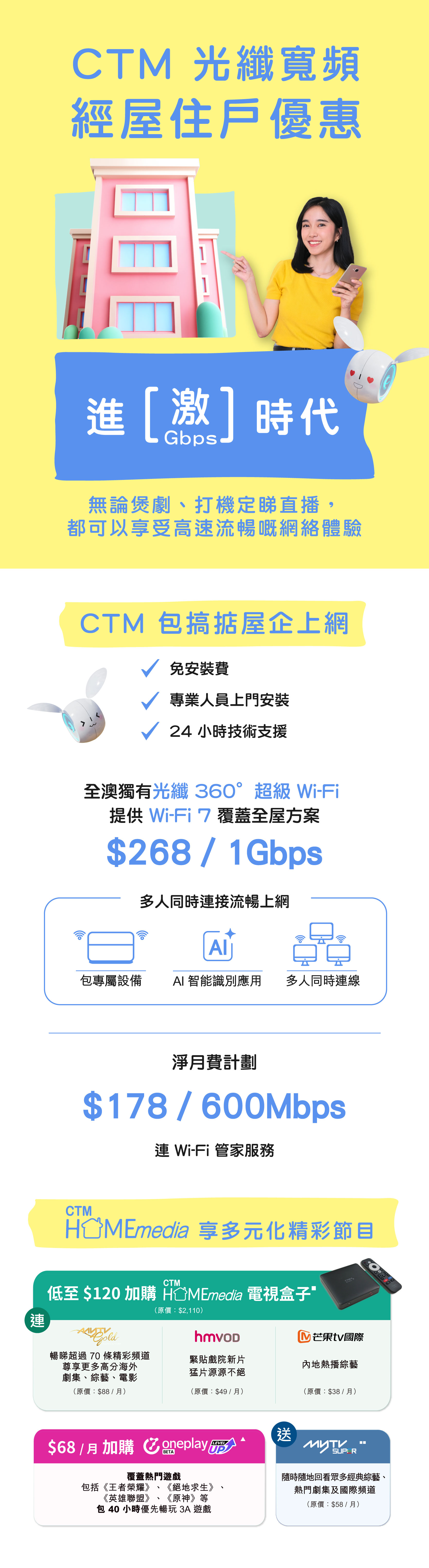 註: - 優惠期至 2025 年 10 月 31 日。 - 優惠只適用於新申請 / 現有無產品合約束縛之客戶,客戶需簽署 24 個月合約。客戶若於申請日前 2 個月內有取消 / 降級服務紀錄,並重新申請上網,該客戶將不可獲得此優惠。申請光纖 360° 服務包括一個數據機及兩個路由器。如客戶因空間或使用需求需額外增加路由器,每個額外路由器之優惠月費為 $10(原價:$15 / 月)。 - 此優惠適用對象為經屋住戶,以及光纖寬頻安裝地址必須為經濟房屋方可享有指定優惠,每個客戶只可享優惠乙次。 - 以上優惠及最新價格如有更改,恕不另行通知。貨 / 贈品數量有限,售 / 送完即止。 - 所有價格以澳門幣計算。 - 以上優惠受相關之服務條款所約束。以 CTM 的可接受使用政策 (AUP) 為準。 |