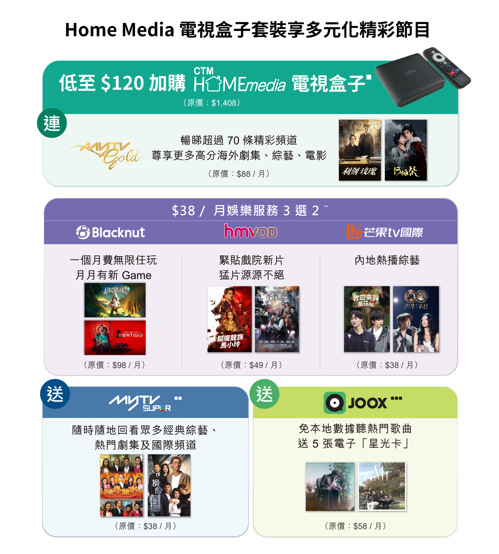 ~ 新申請或續約居家光纖寬頻 / 流動電話月費之客戶,可享 $38 / 月任選兩項 Home Media 娛樂服務(芒果 TV 國際至尊服務 / Blacknut 雲遊戲服務 / hmvod 服務)。優惠期至 2026 年 3 月 31 日。首 3 個月優惠期後,如客戶繼續使用相關服務,將以月費優惠組合 $48 / 月於賬單內自動收取。