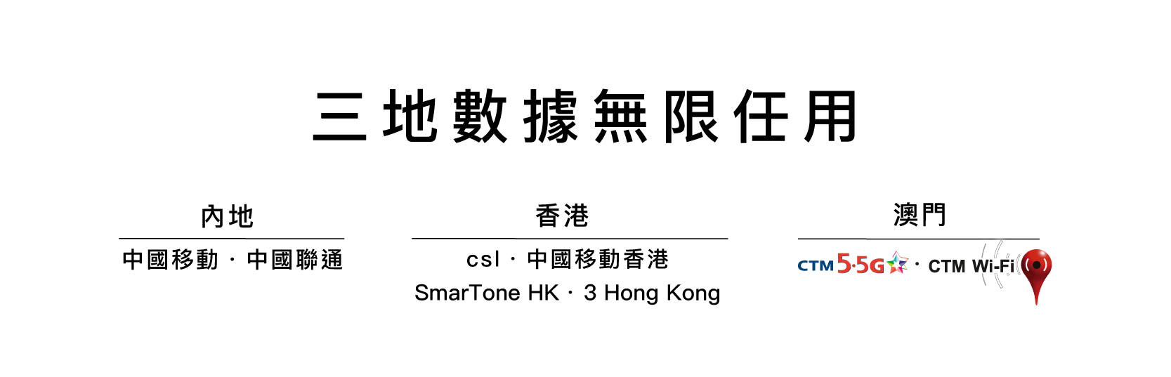 - 三地計劃服務之生效時間為翌日晚上 8 時後。客戶於香港須選用「中國移動香港」、「CSL」、「SmarTone HK」或「3 Hong Kong」漫遊網絡商,於中國內地須選用「中國移動」或「中國聯通」漫遊網絡商。