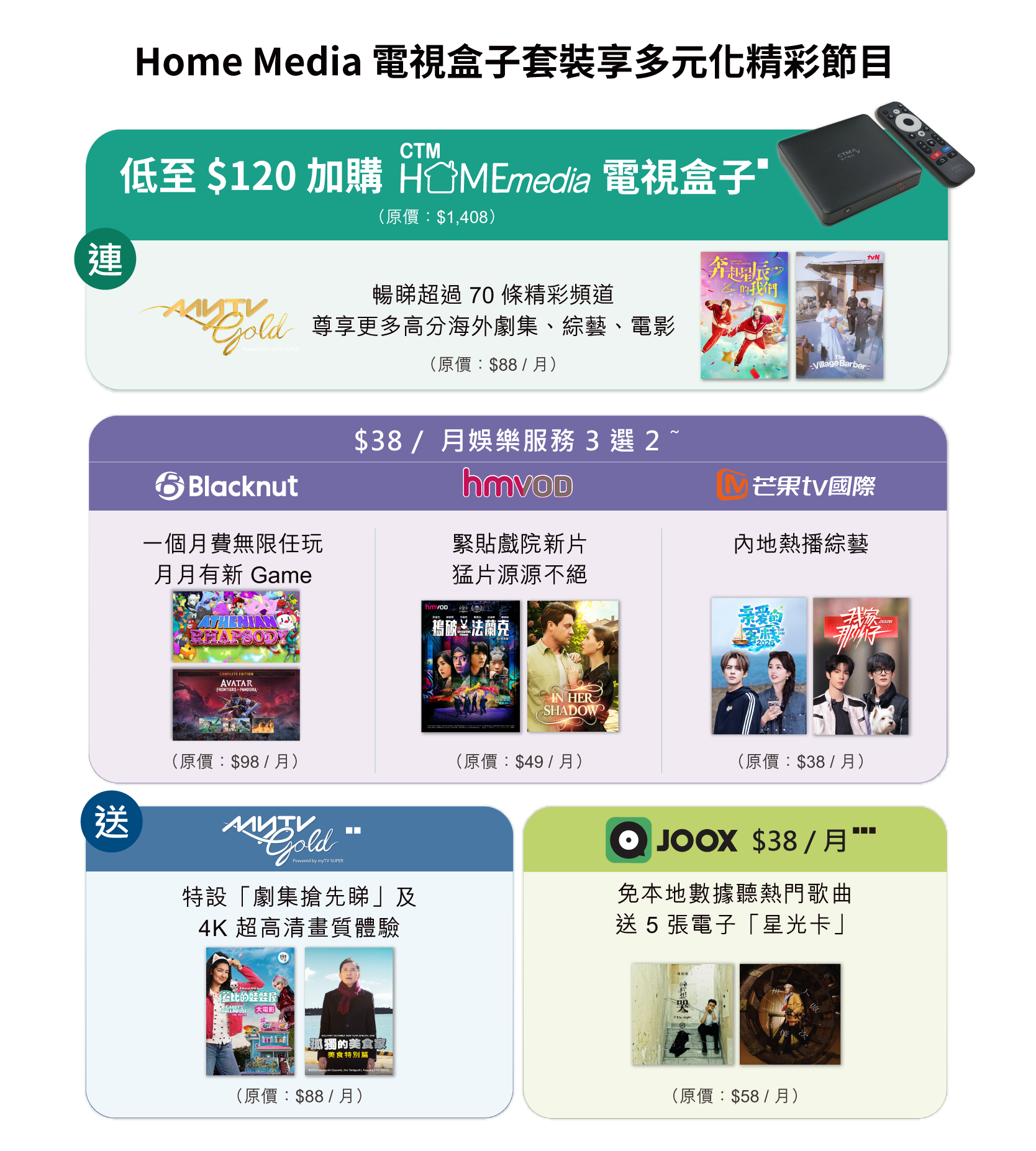 ▪▪▪ 此優惠只適用於新申請 Home Media 娛樂服務 – JOOX 服務之流動電話月費客戶。首 3 個月優惠期後,若客戶繼續使用相關服務,將以優惠月費 $48 / 月(原價:$58 / 月)於賬單內自動收取。每名新訂閱 Home Media 娛樂服務 - JOOX 服務之客戶可獲 5 張指定「電子星光卡」,數量有限,先到先得,額滿即止。