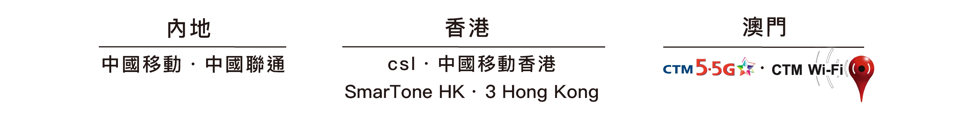 - 三地計劃服務之生效時間為翌日晚上 8 時後。客戶於香港須選用「中國移動香港」、「CSL」、「SmarTone HK」或「3 Hong Kong」漫遊網絡商,於中國內地須選用「中國移動」或「中國聯通」漫遊網絡商。