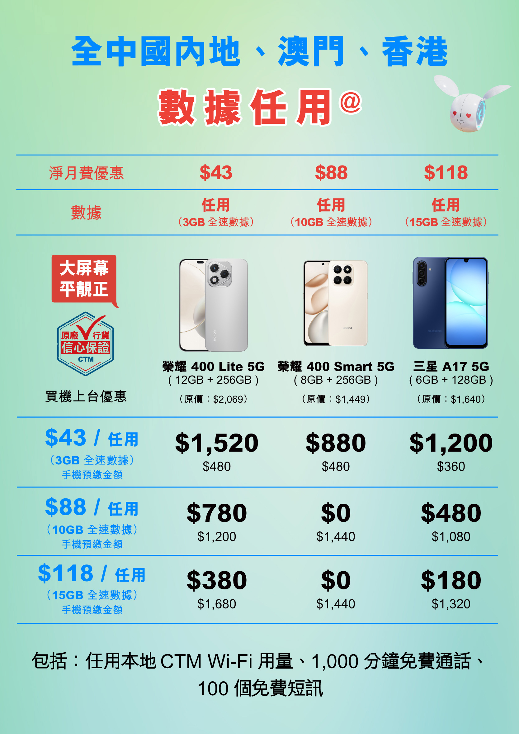 - 於海外使用漫遊數據服務時,客戶需額外繳付根據當地流動通訊網絡商之漫遊數據收費模式之費用。