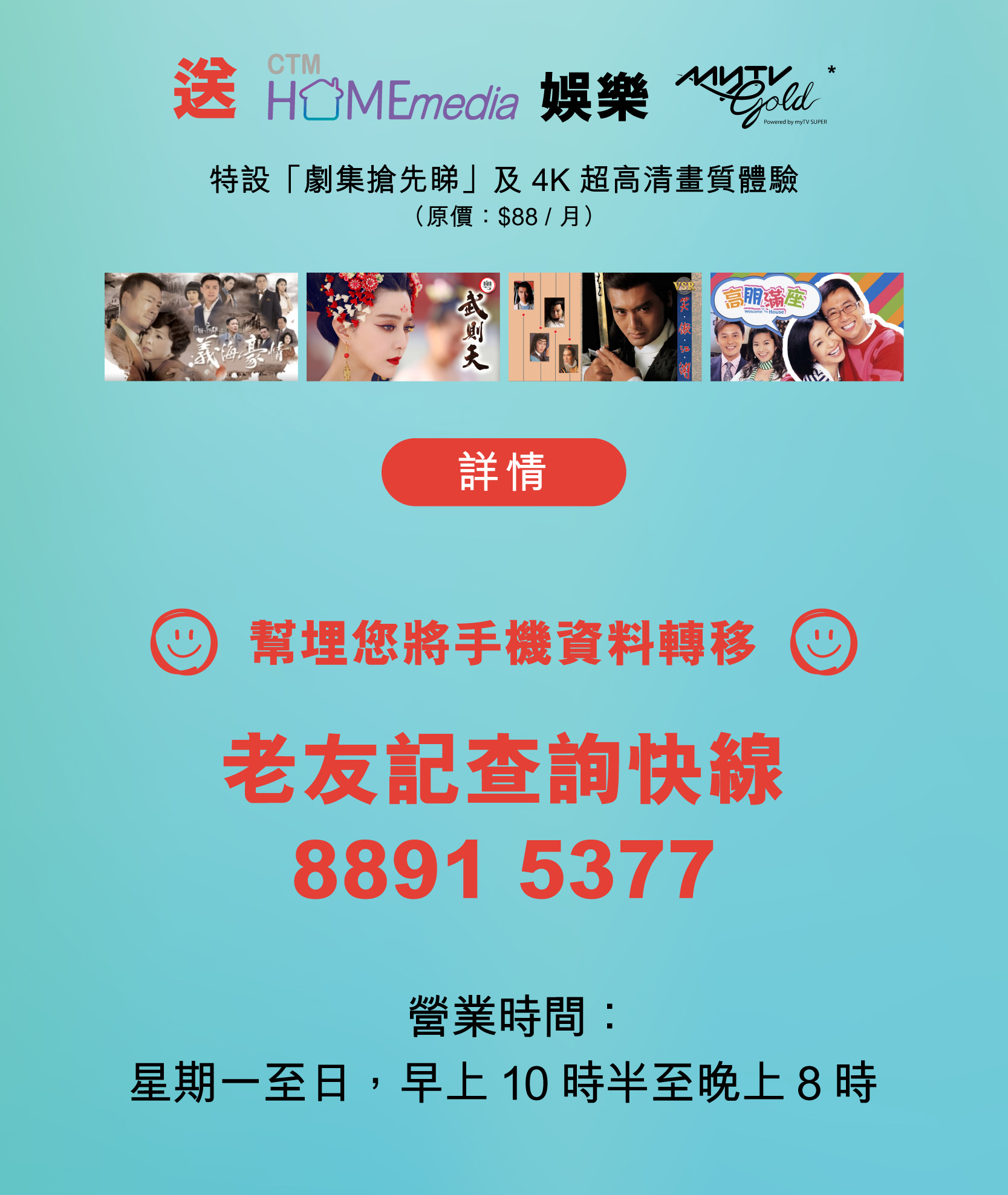 * 申請 5.5G (5G-A) 月費計劃之客戶,即送 1 個月 Home Media 娛樂服務 – myTV Gold 服務 (1 個裝置電視盒子版 / 智能電視版 + 2 個裝置 App / 網頁版)(原價:$88 / 月),優惠期後服務自動停止。