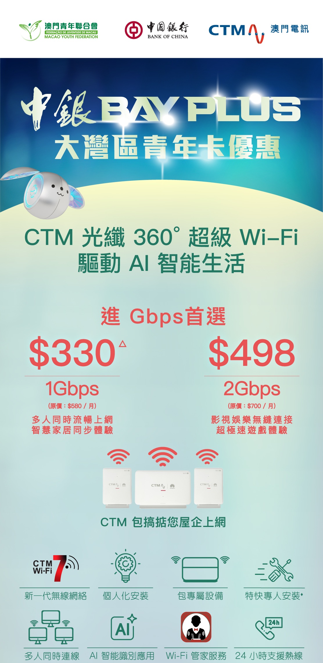 註:優惠期至 2025 年 12 月 31 日。優惠只適用於互聯網月費客戶。以上優惠受相關之服務條款所約束。優惠不可與其他優惠同時使用。以上優惠及最新價格如有更改,恕不另行通知。所有價格以澳門幣計算。