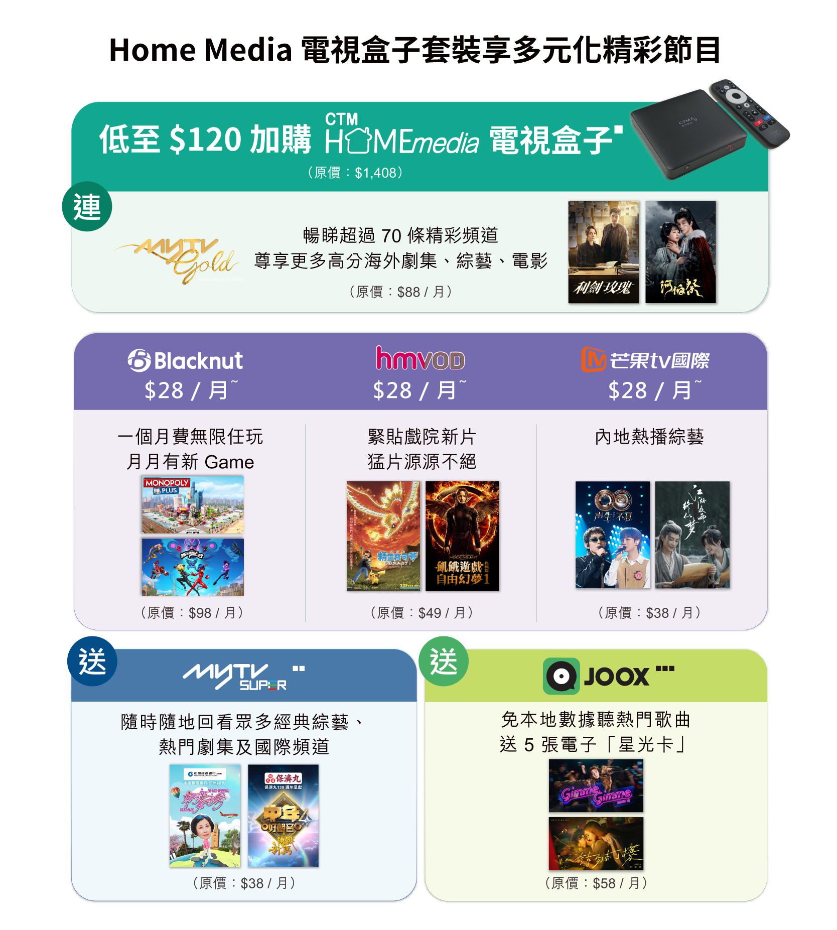 ~ 此優惠只適用於新申請 Home Media 娛樂服務 - 芒果 TV 國際至尊服務 / Blacknut 雲遊戲 / hmvod 服務之流動電話 / 居家光纖寬頻客戶,且每個娛樂服務均以 $28 / 月計算。首 12 個月優惠期後,如客戶繼續使用相關服務,將以原優惠月費(芒果 TV $38,Blacknut $60,hmvod $38)於賬單內收取。