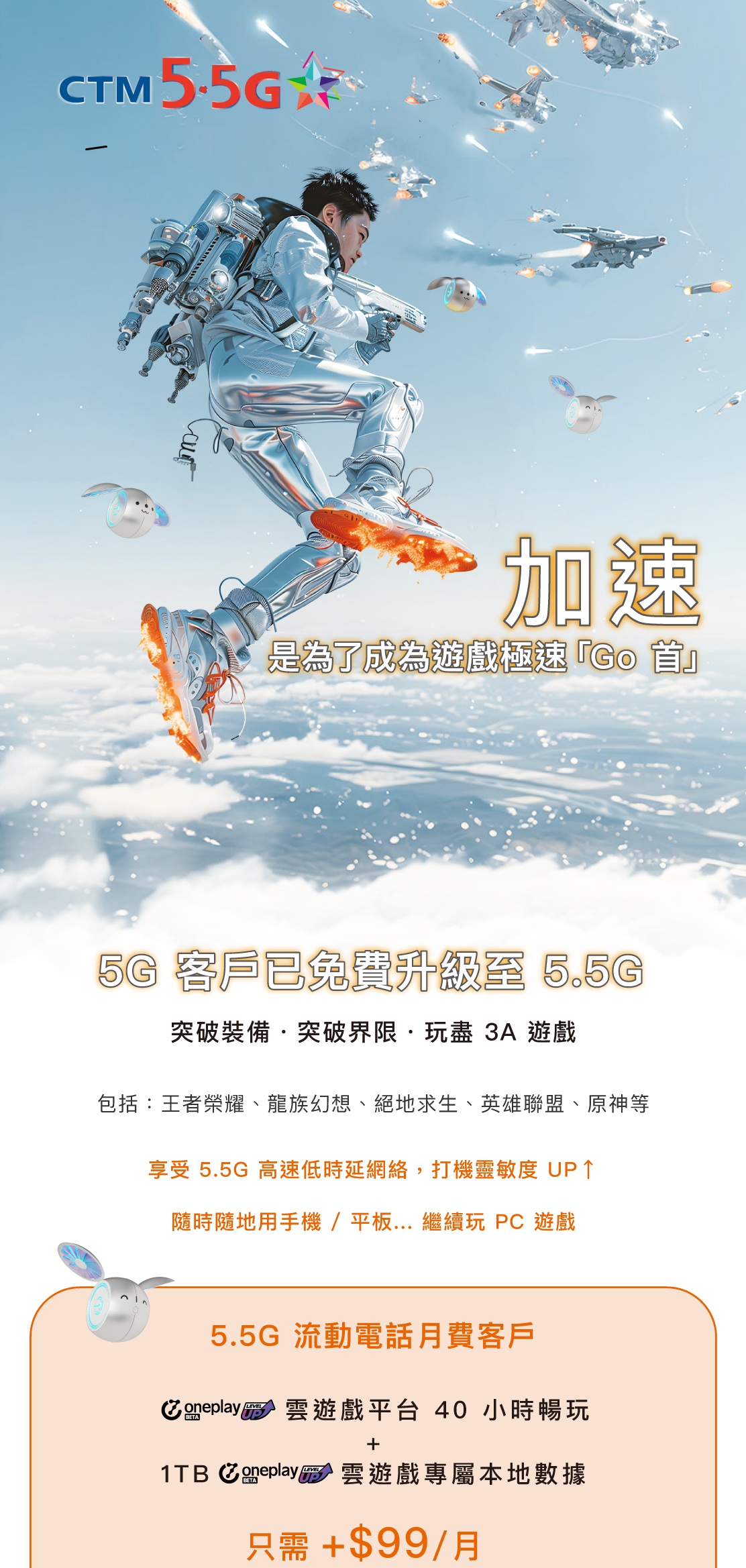註:優惠期至 2025 年 10 月 31 日。優惠期及最新優惠內容以網頁版為準。優惠只適用於 5.5G 流動電話月費 / 光纖寬頻客戶。以上優惠受相關之服務條款所約束。優惠不可與其他優惠同時使用。以上優惠及最新價格如有更改,恕不另行通知。所有價格以澳門幣計算。